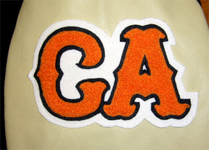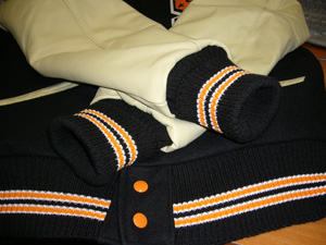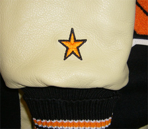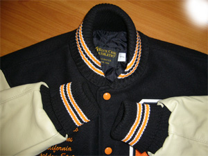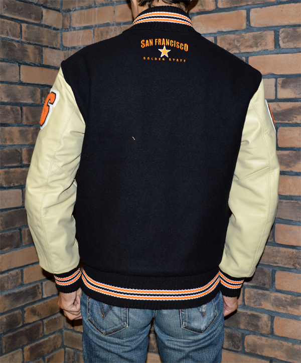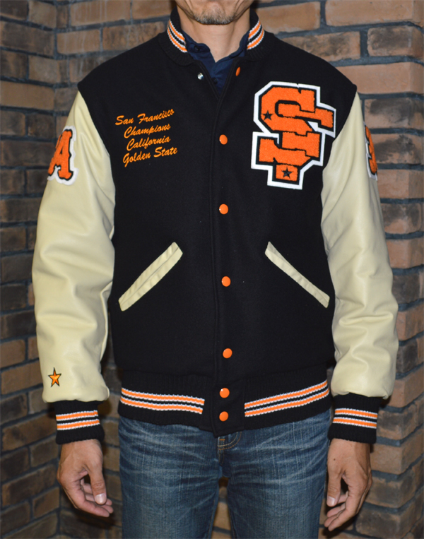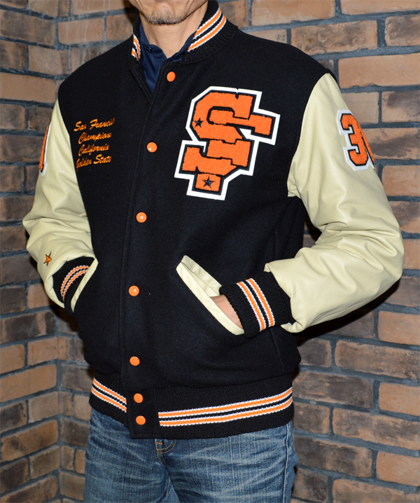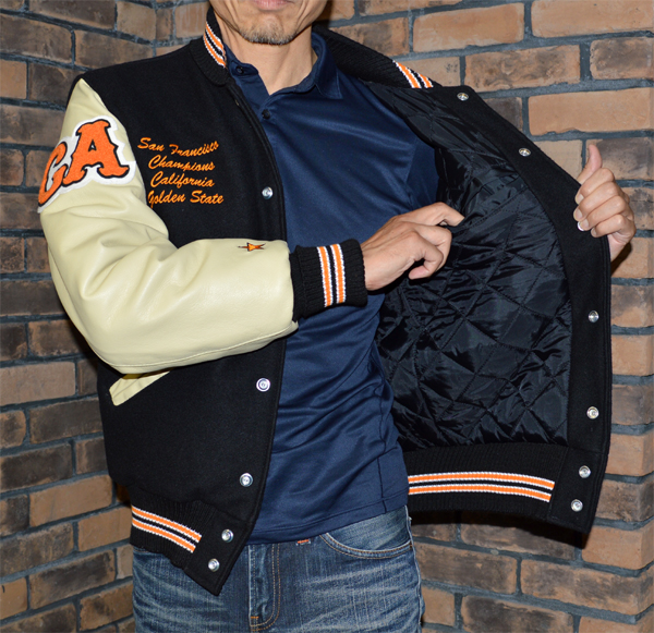 24オンスのメルトンボディカラーはのブラックで袖革には相性の良いナチュラル色を採用しました。デコレーションはブラックとオレンジの最強2色で構成。これぞ鉄板スタジャンです。袖皮革のナチュラル色は3年以上着続けていただけば、素敵なエイジングも楽しめます。雰囲気は大人のスタジャン!